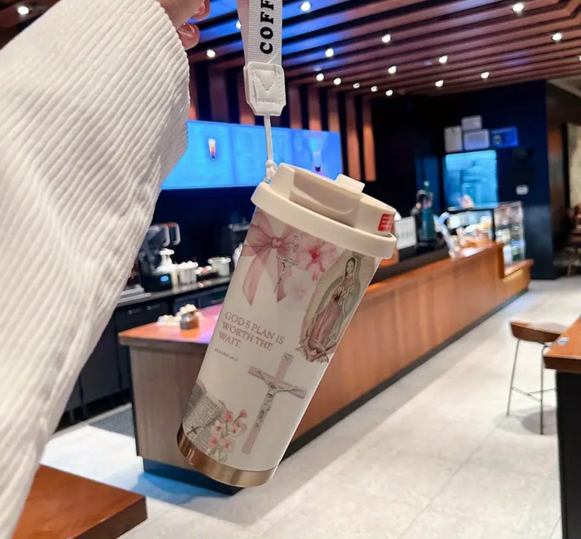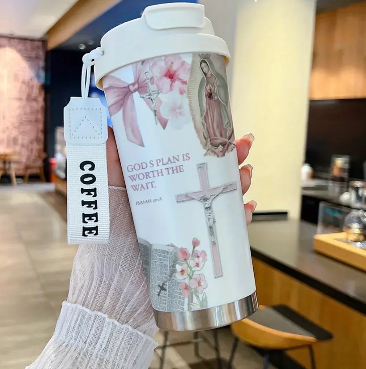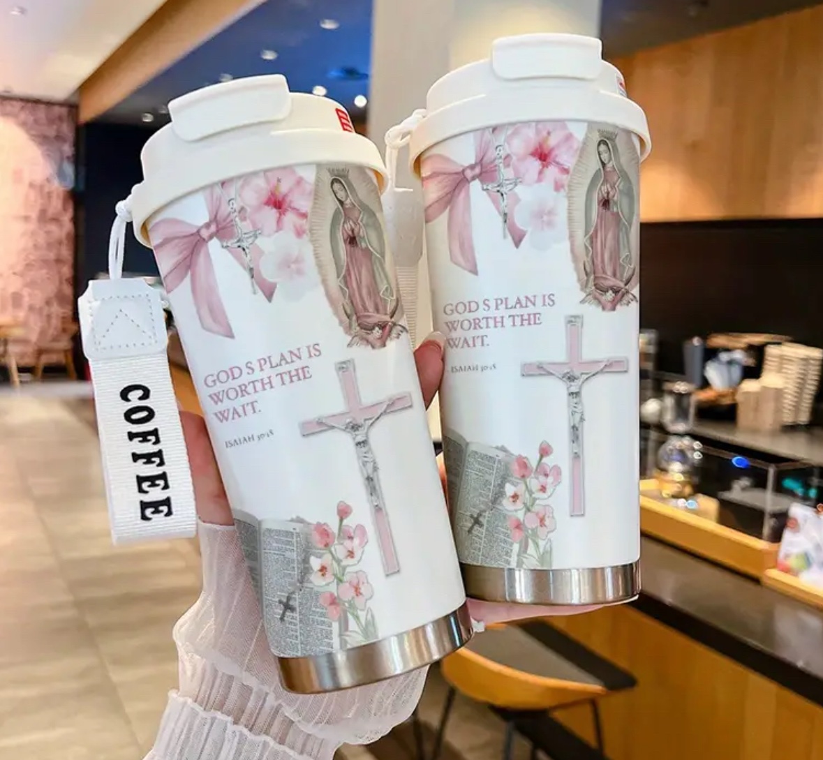 Acabado Metálico Elegante, Motivo de Cruz, Termo Aislante, Taza de Café,