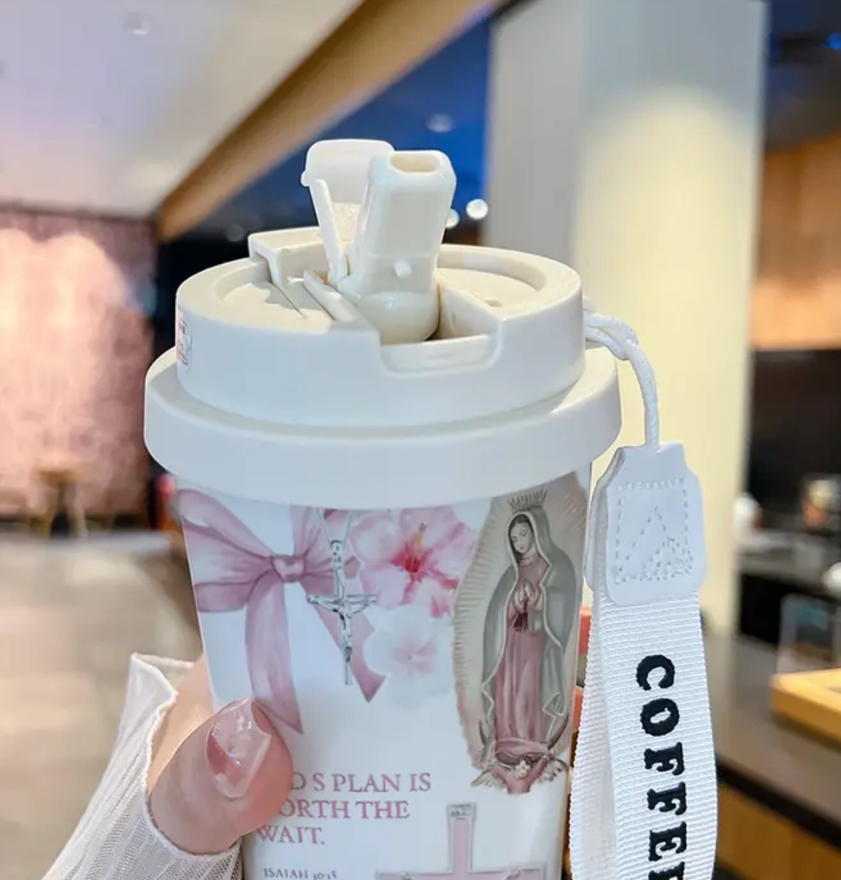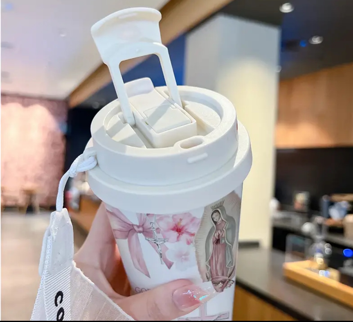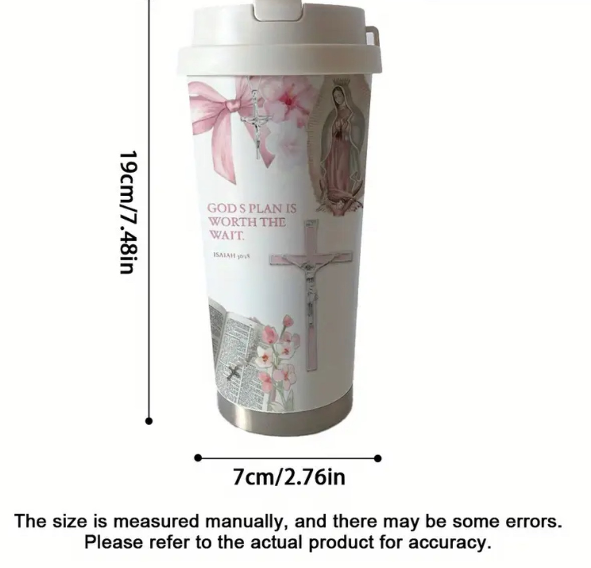 Vaso térmico con diseño de Virgen de Guadalupe, Cruz y Escritura.